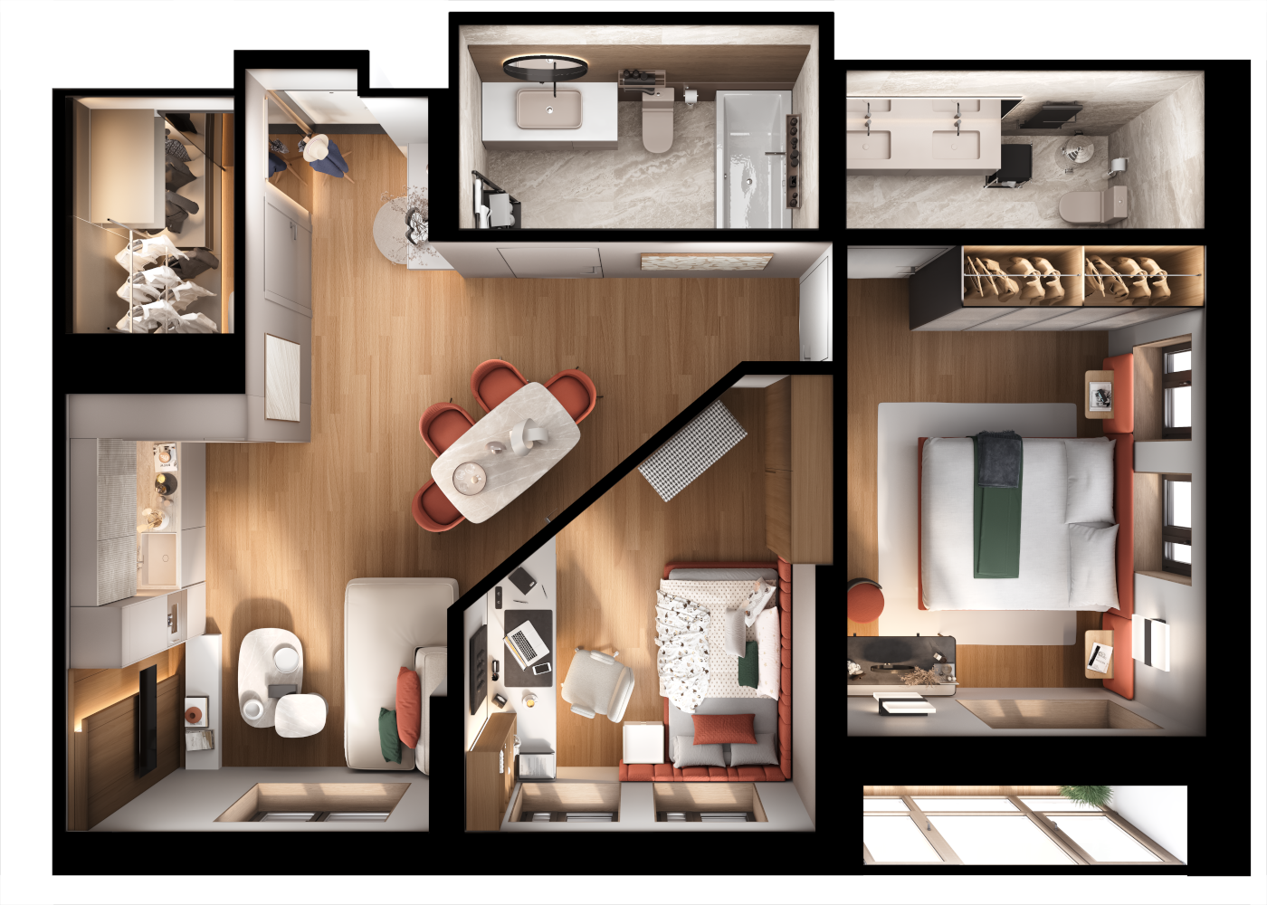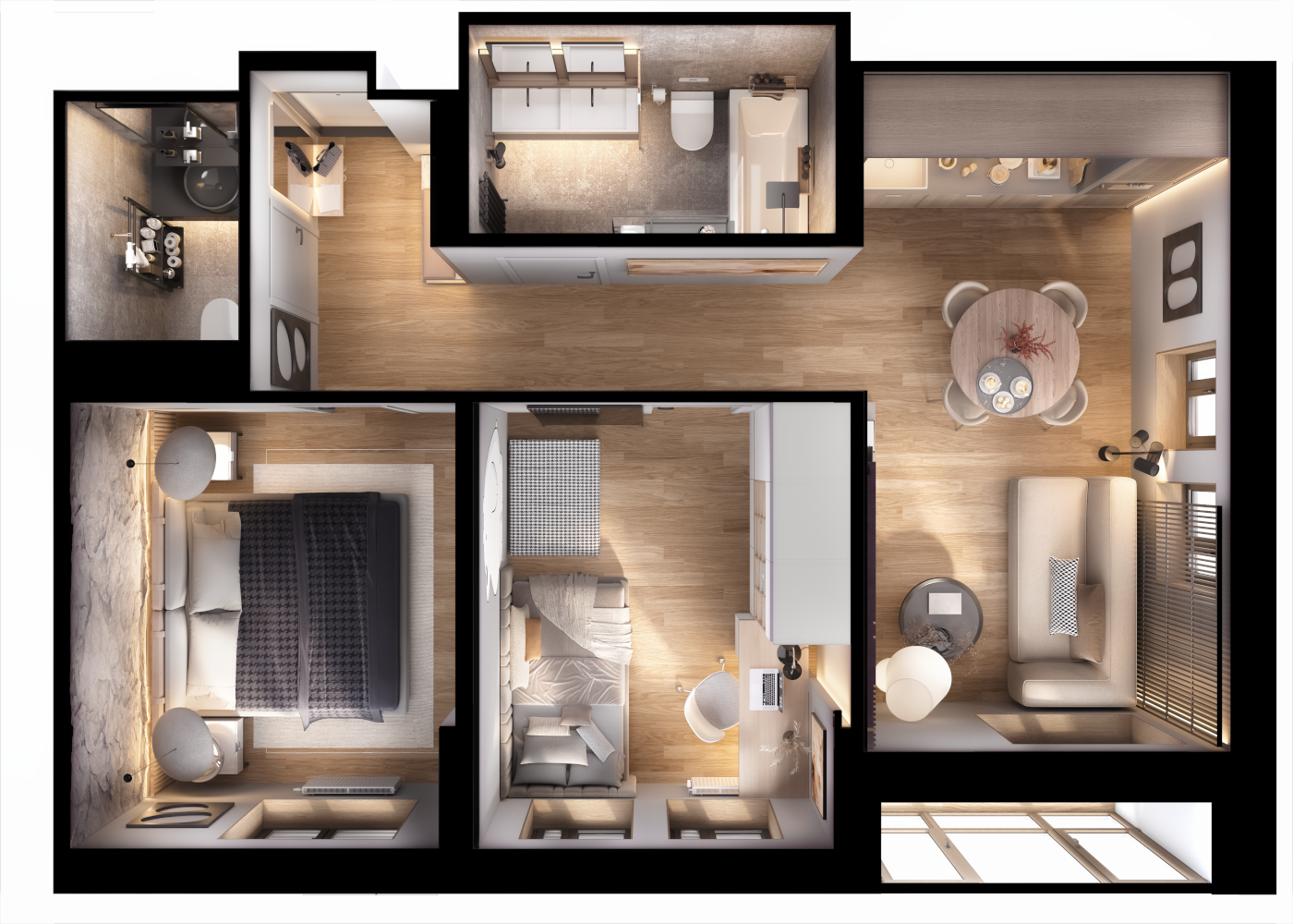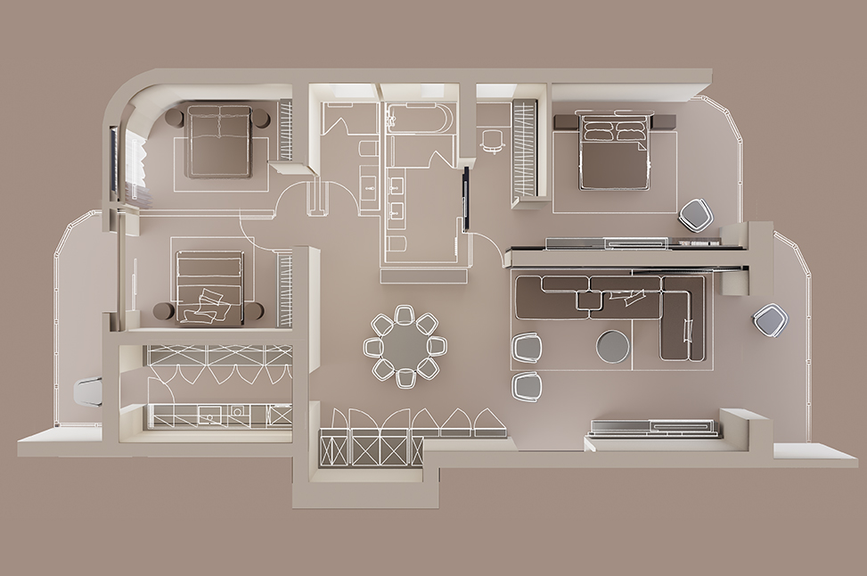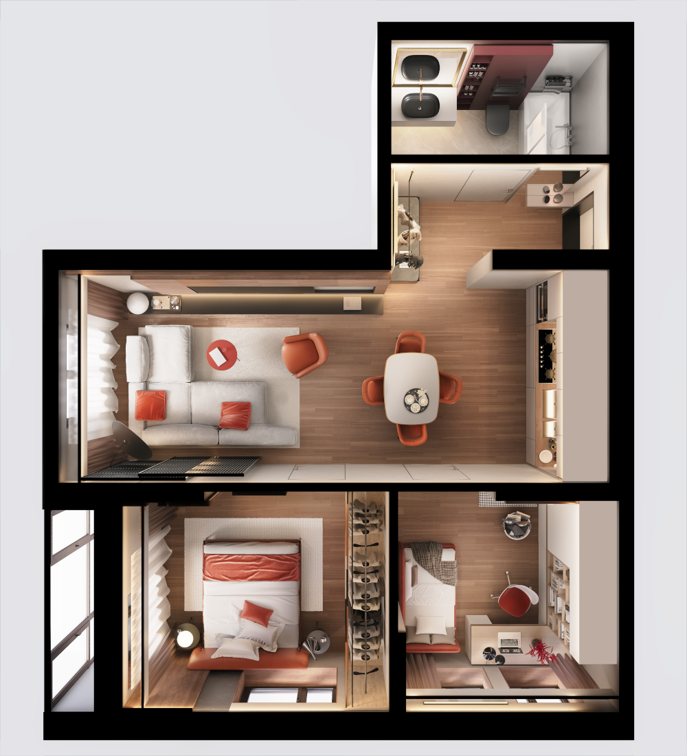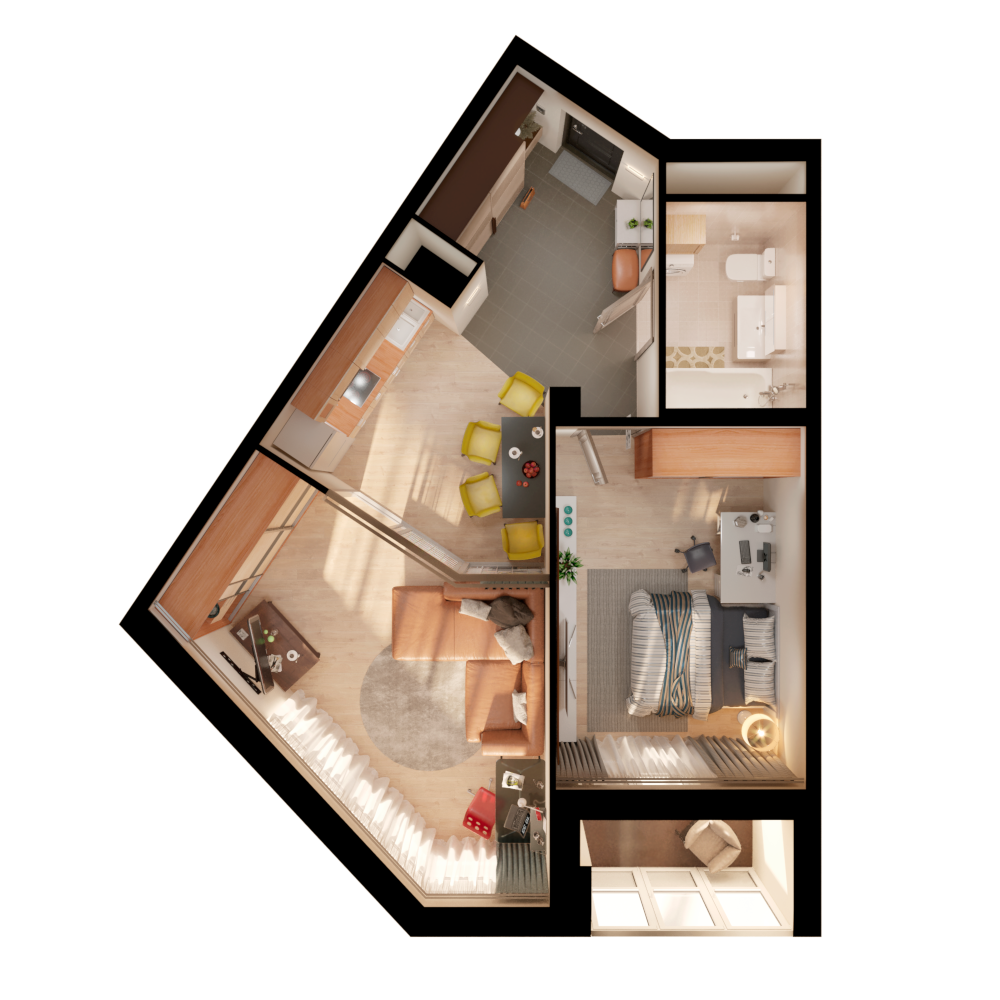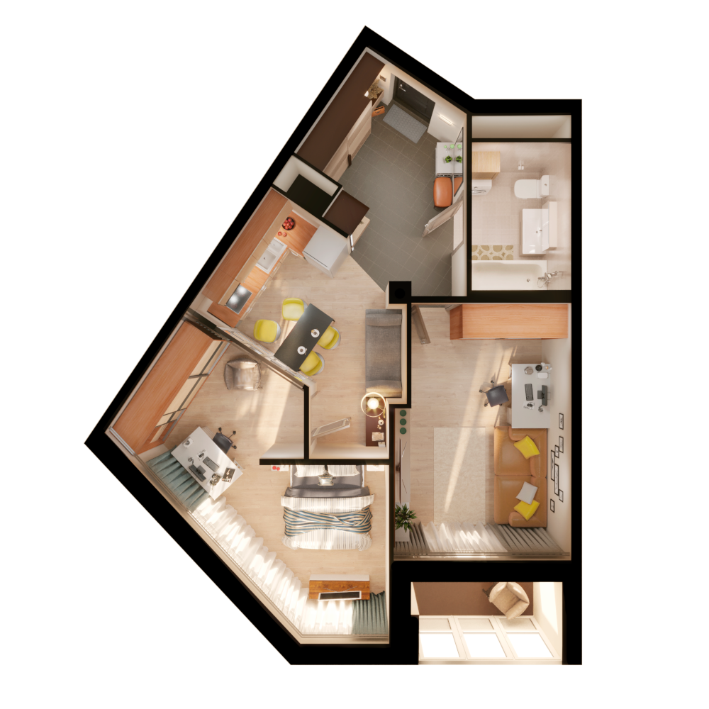 3D-планировка показывает не только, где расположены в квартире окна, но и как падает свет в зависимости от времени суток. Это нужная опция, которая помогает создать удобную и функциональную среду. Например, в идеальном месте разместить рабочую зону.