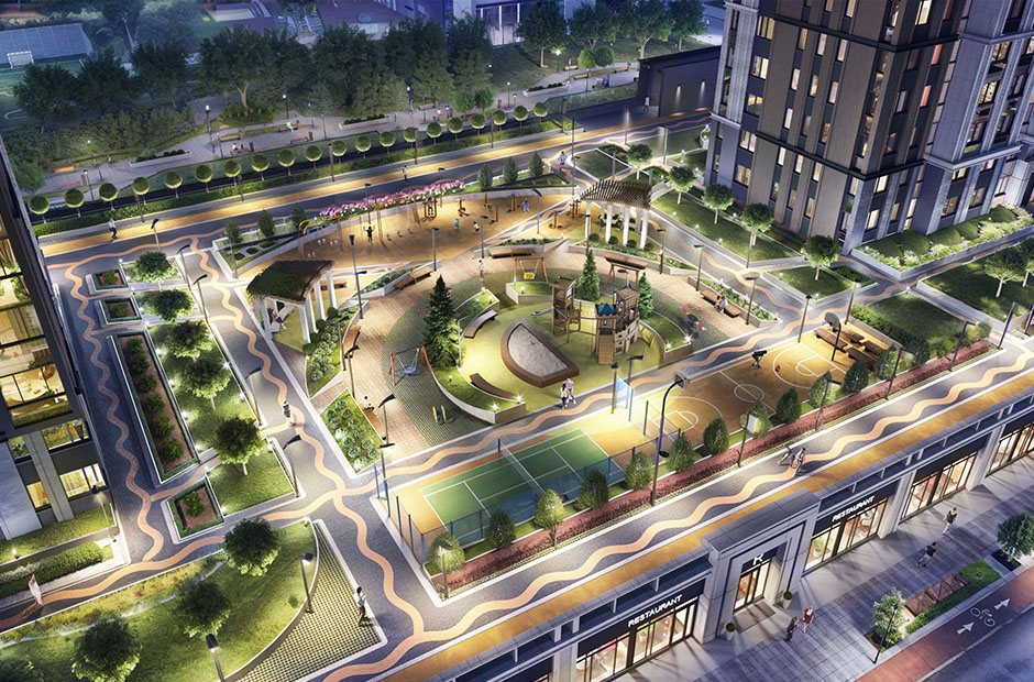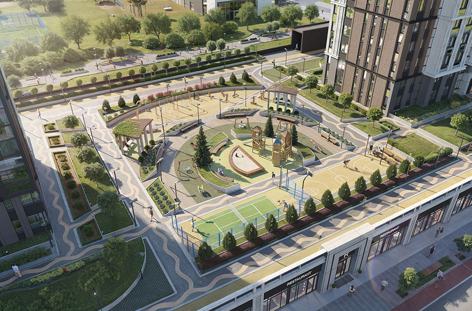 Цель разработки архитектурной визуализации экстерьера для маркетолога — продажа квартир в строящемся объекте. Именно поэтому мы уделяем особое внимание настроению и окружению: инфраструктуре, благоустройству, людям, с которыми покупатель ассоциирует себя. Это живые рендеры в ярких и смелых тонах.